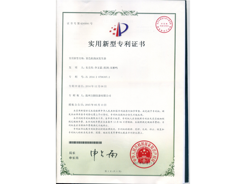 中國實用新型專利:染色機(jī)泡沫發(fā)生器(ZL 2014 2 0796307.2)