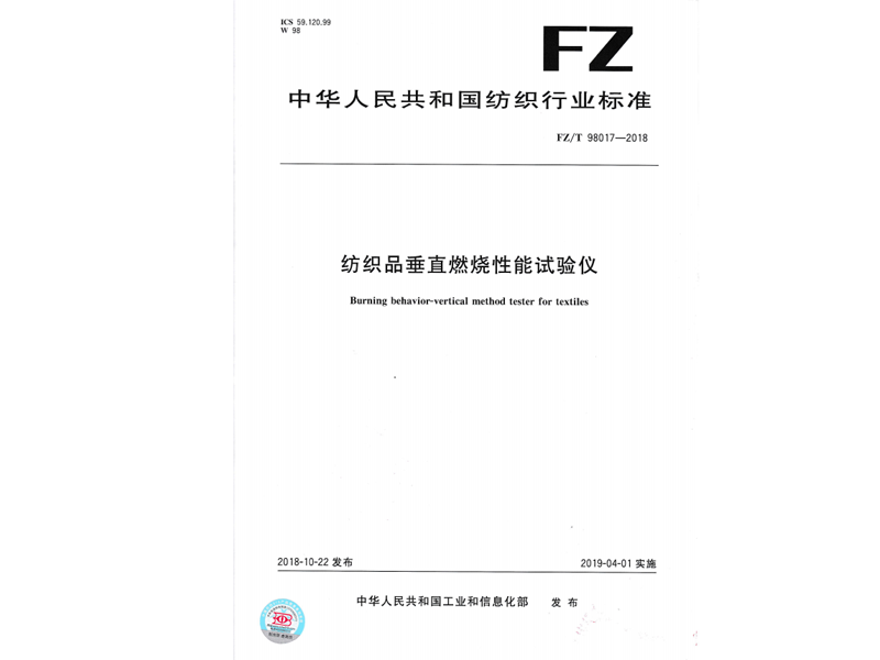 參與起草《紡織品垂直燃燒性能試驗儀》(FZ/T 98017-2018),該標(biāo)準(zhǔn)由中華人民共和國工業(yè)和信息化部于 2018-10-22 發(fā)布